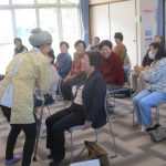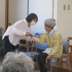 冒頭、羽衣の園ケアマネジャーが改めて自己紹介後、全員で羽衣の園の日課である“リハビリ体操”を実施。会場が一気に和やかムードとなり、参加者の皆さんも自然と笑顔に。
